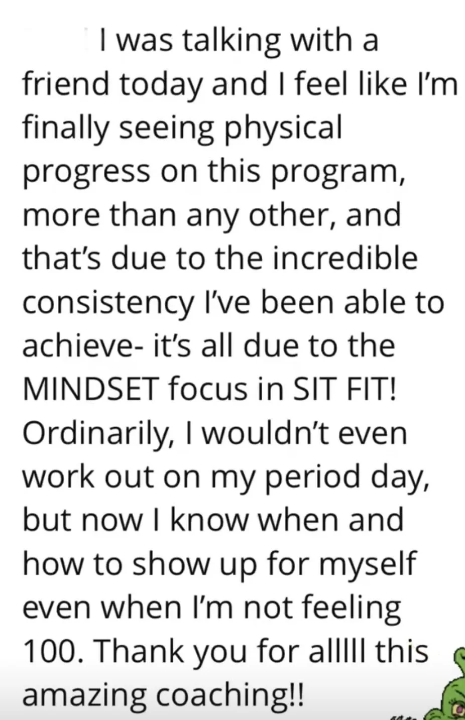 "SIT FIT has really helped me think about movement, fitness, and nutrition as part of my day to day life as something that can just happen. It doesn't have to be a huge deal or something that I have to force and have a lot of feelings about. It's so empowering to realize that doing little things adds up! I'm proud of making small changes."