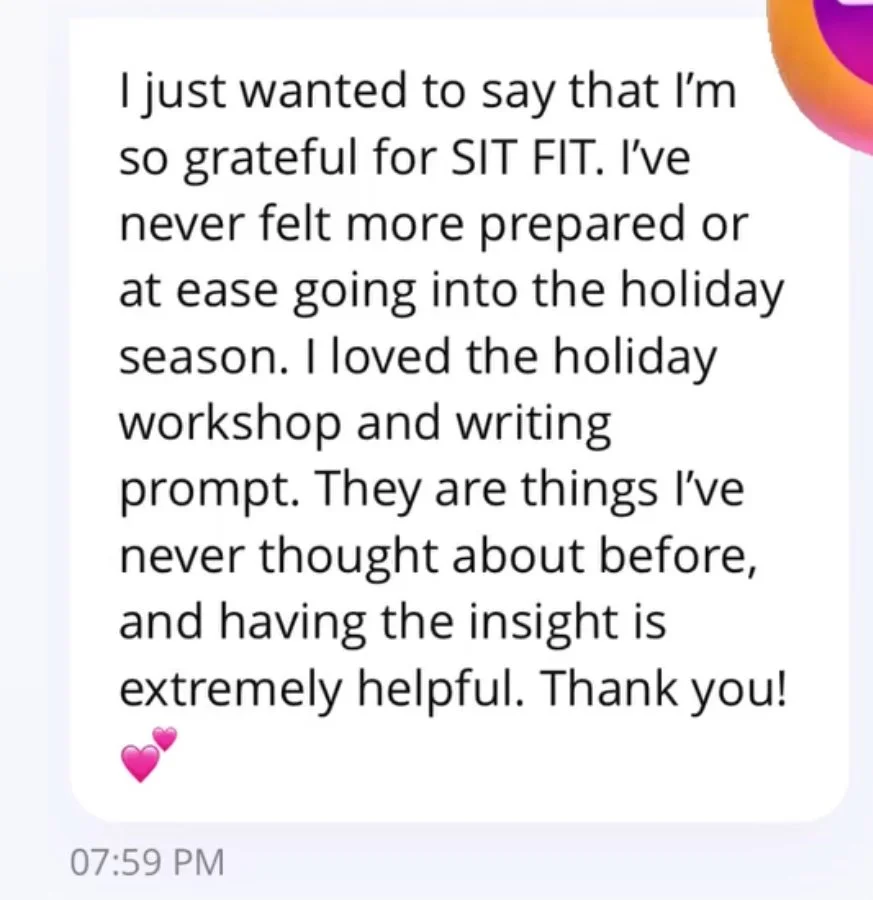 SIT FIT would be a supplemental/accompanying group that would offer additional accountability, workouts/programming for when you're not in your studio, tons of nutrition information and strategies, more community, and access to coaching and support from me.