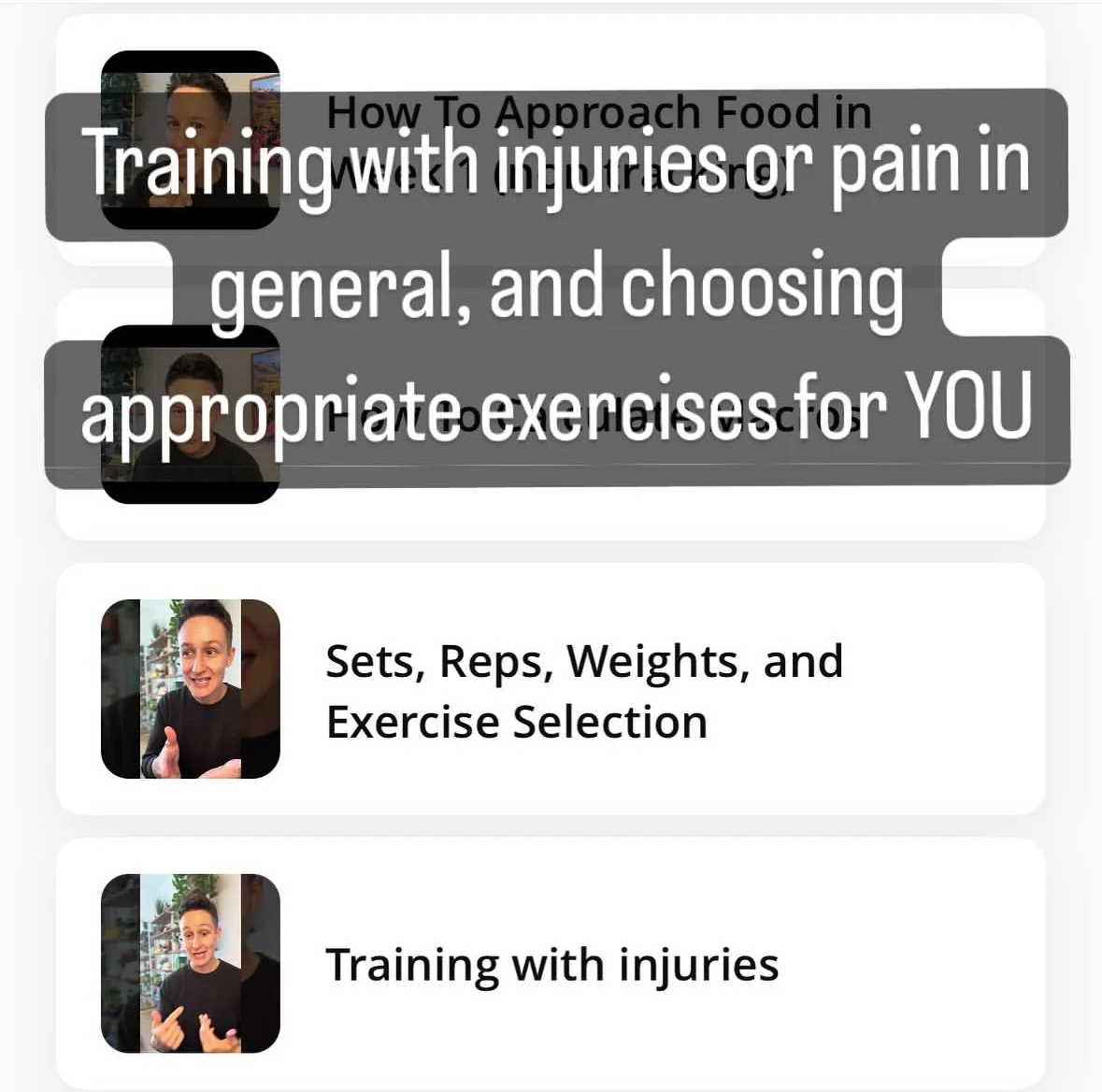 Workouts: You’ll get access to full gym programs, follow along home programs, 5, 10, and 15 min exercise snacks, along with mobility and soft tissue work.